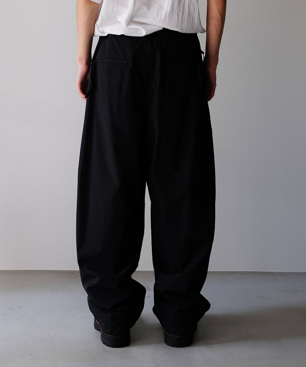 <<商品説明>>Product Twelve(プロダクトトゥエルブ)のテックパンツ。裾のアジャスターでフォルムチェンジ可能なワイドストレートパンツ。撥水、防風、ストレッチの機能に長けた軽量な機能素材に、メッシュ裏地の総裏で全天候、オールシーズン着用可能。ウエストは、モールシステムの様なパートステッチとなり、GIバックルで固定する独自のディテールがデザイン的なアクセントにもなっています。