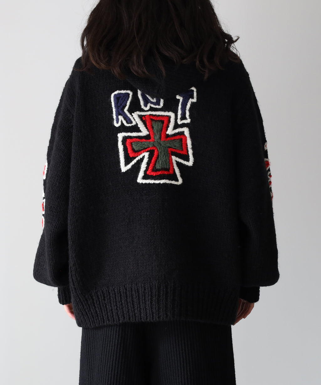 <<商品説明>>RICENINETEN(ライスナインテン)のハンドニット。ジップアップパーカーのデザイン。手編みに手刺繍、カルチャーの紋章を手作業でパロディーした同ブランドらしい仕上がり。<<その他>>※商品画像は自然光にて撮影しています。デバイス環境等により色差がある場合が御座います。予めご了承下さいませ。※ショップガイドを必ずご確認くださいませ。