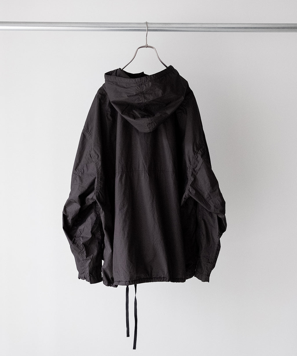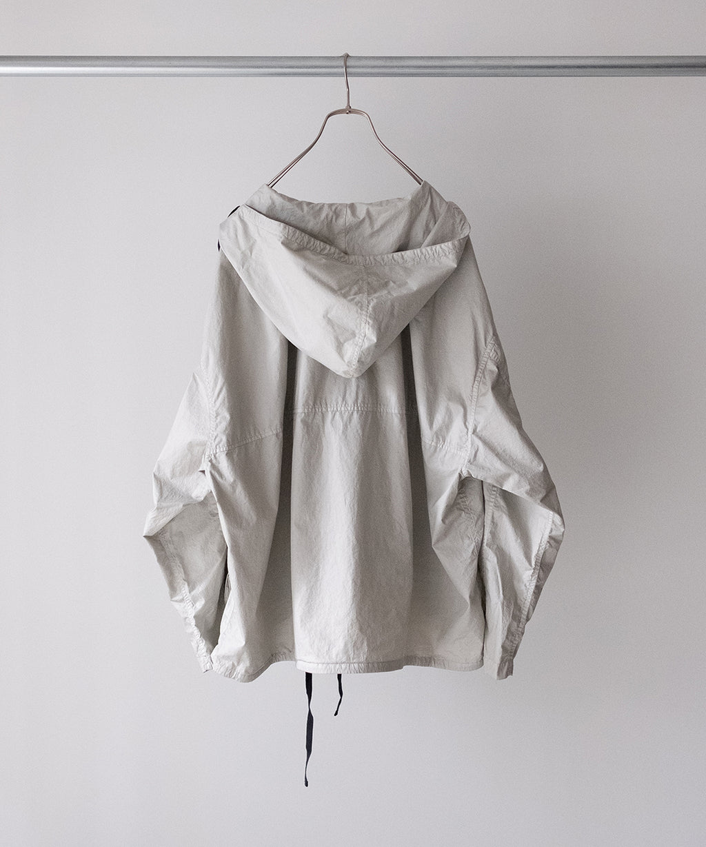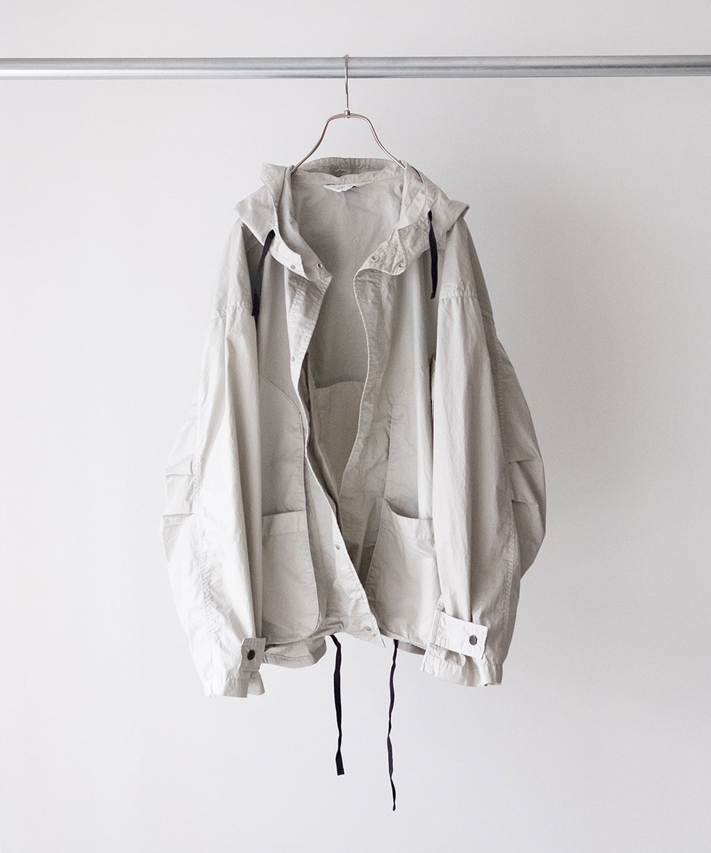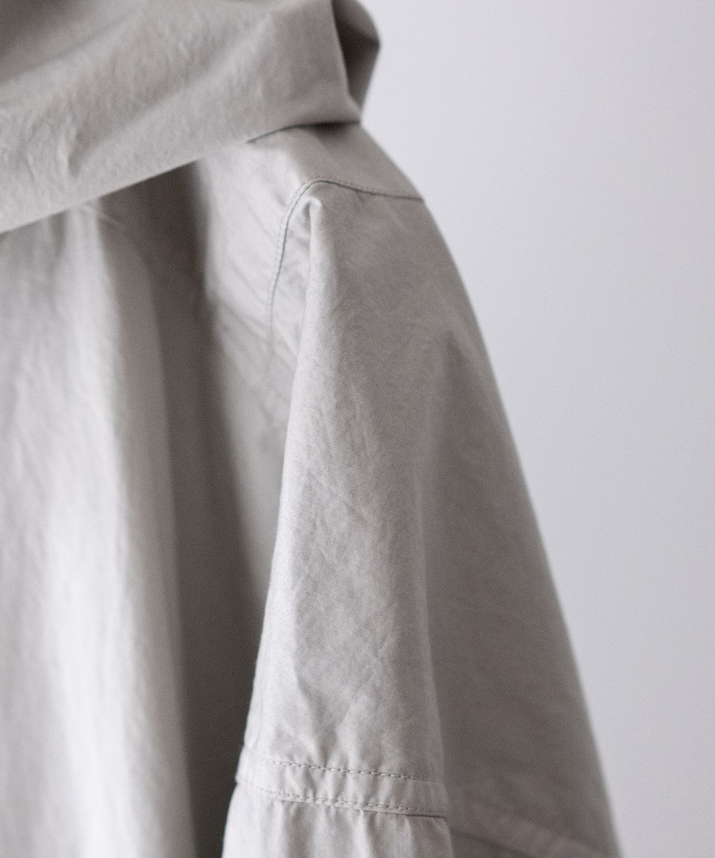 <<商品説明>>ANCELLM(アンセルム)のフードジャケット。ゆったりとしたボクシーシルエット。綺麗なコットンのシャツ生地で作られており、染めによるパッカリングなど有機的な風合いがプラスされてます。