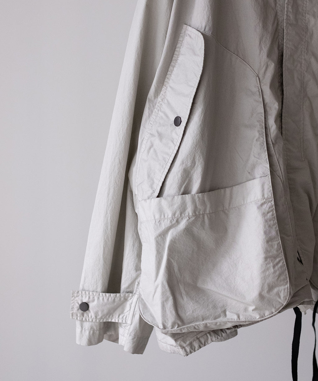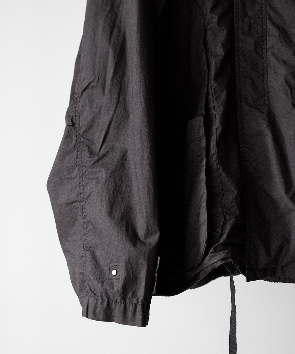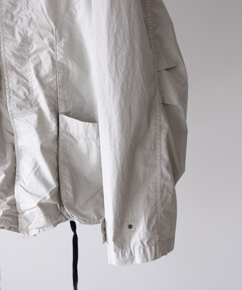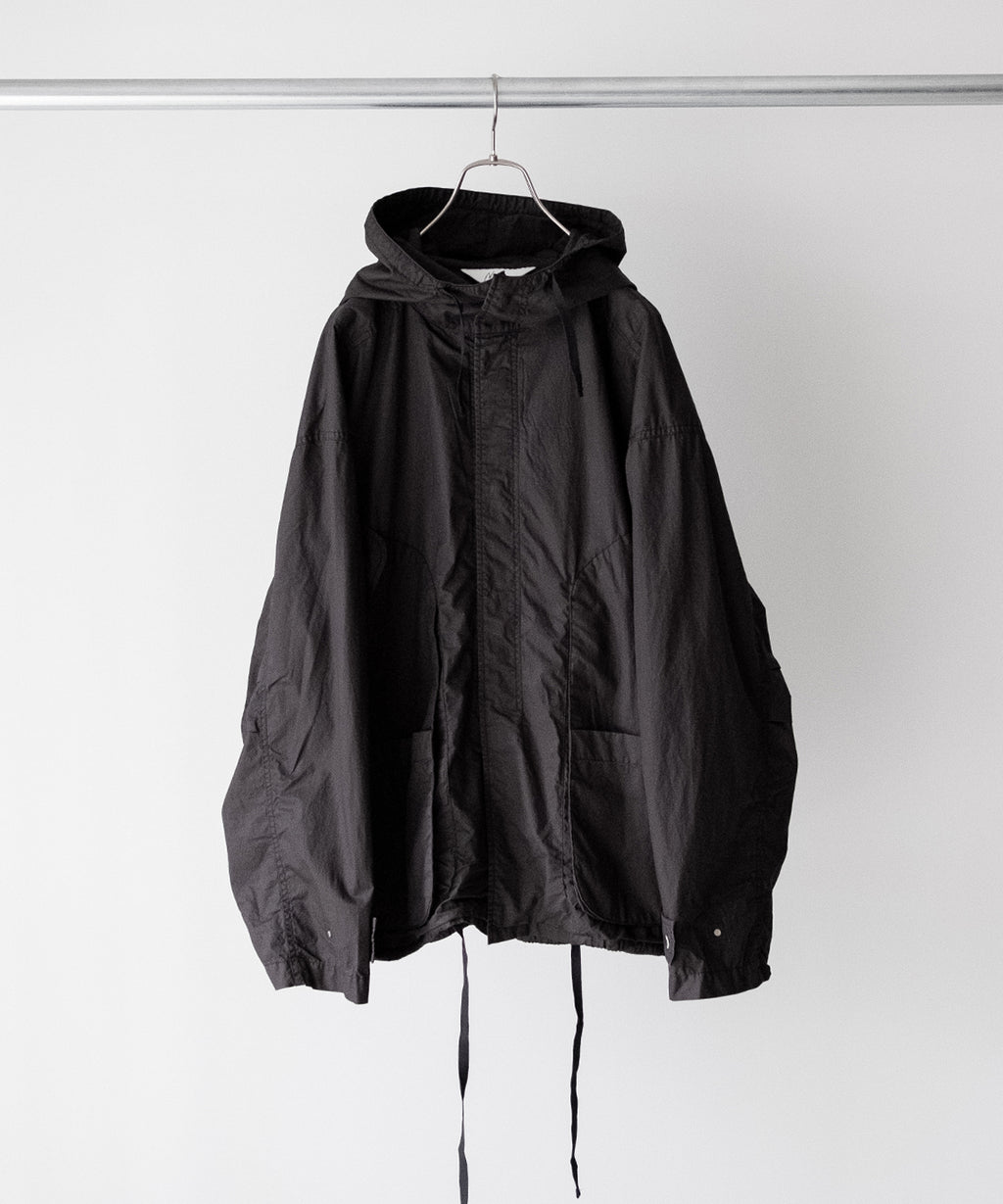 <<商品説明>>ANCELLM(アンセルム)のフードジャケット。ゆったりとしたボクシーシルエット。綺麗なコットンのシャツ生地で作られており、染めによるパッカリングなど有機的な風合いがプラスされてます。