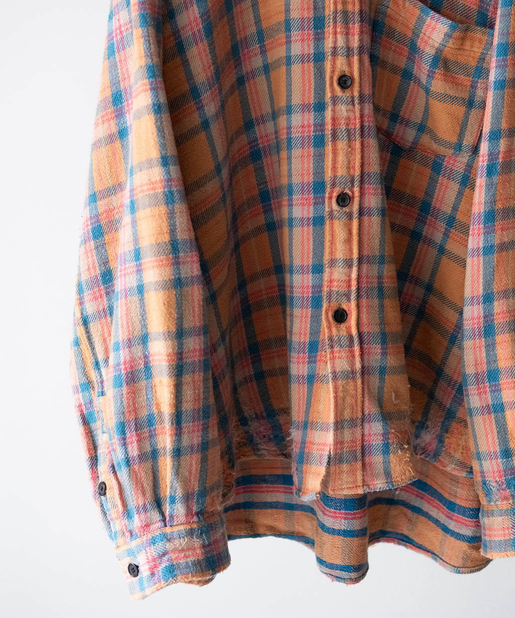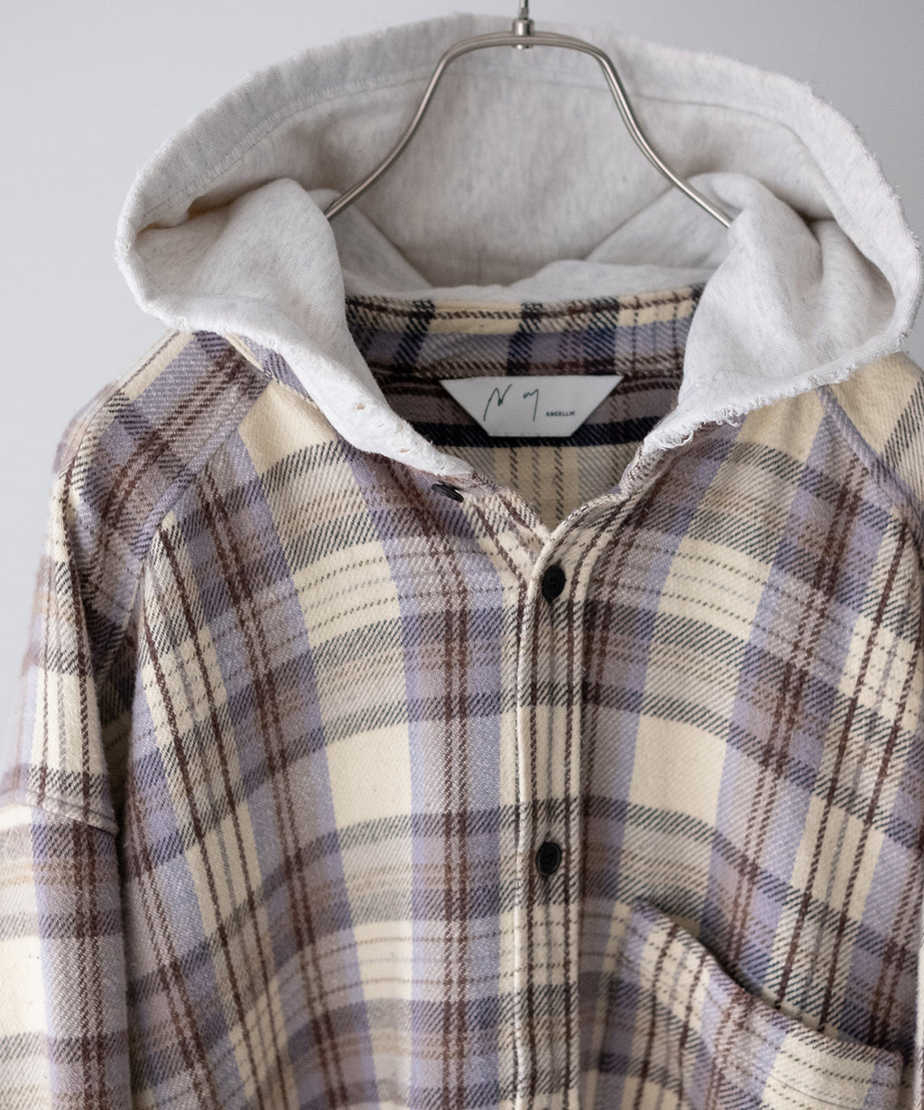 <<商品説明>>ANCELLM(アンセルム)のチェックシャツ。ゆったりとしたワイドシルエット。スウェットのフードがドッキングしたどこか懐かしさあるデザインです。肉厚のコットンネル。着古した様な風合いになるまで洗われ、表面はサンシェイドやあたり感ある加工もプラスされた、古着にありそうで、古着にない現代的なバランスで仕上げられてます。