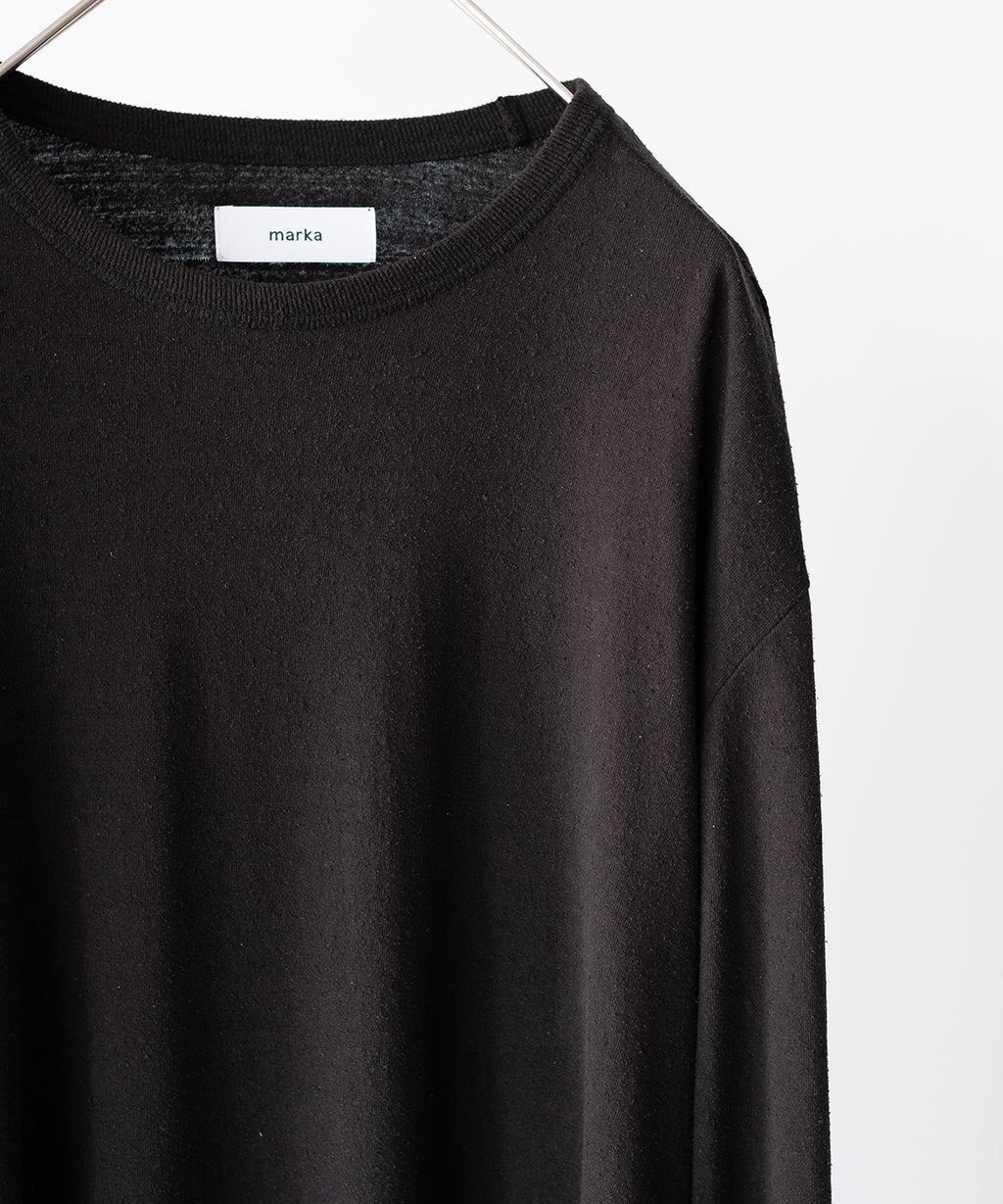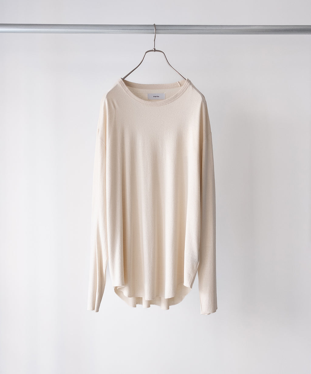<<商品説明>>marka (マーカ)、シルクノイルで作られたロンTee。程よくリラックスしたサイズ感、裾がラウンドした形状のデザイン。ラウンドした裾型であることで、タックインはしやすく、レイヤードした際の上物とのレイヤードにも機能します。粒々としたネップがあり、パイルの様な柔らかなタッチ。ハリのないしなやかで心地よい質感です。<<生産国>>日本<<その他>>※商品画像は自然光にて撮影しています。デバイス環境等により色差がある場合が御座います。予めご了承下さいませ。※ショップガイドを必ずご確認くださいませ。