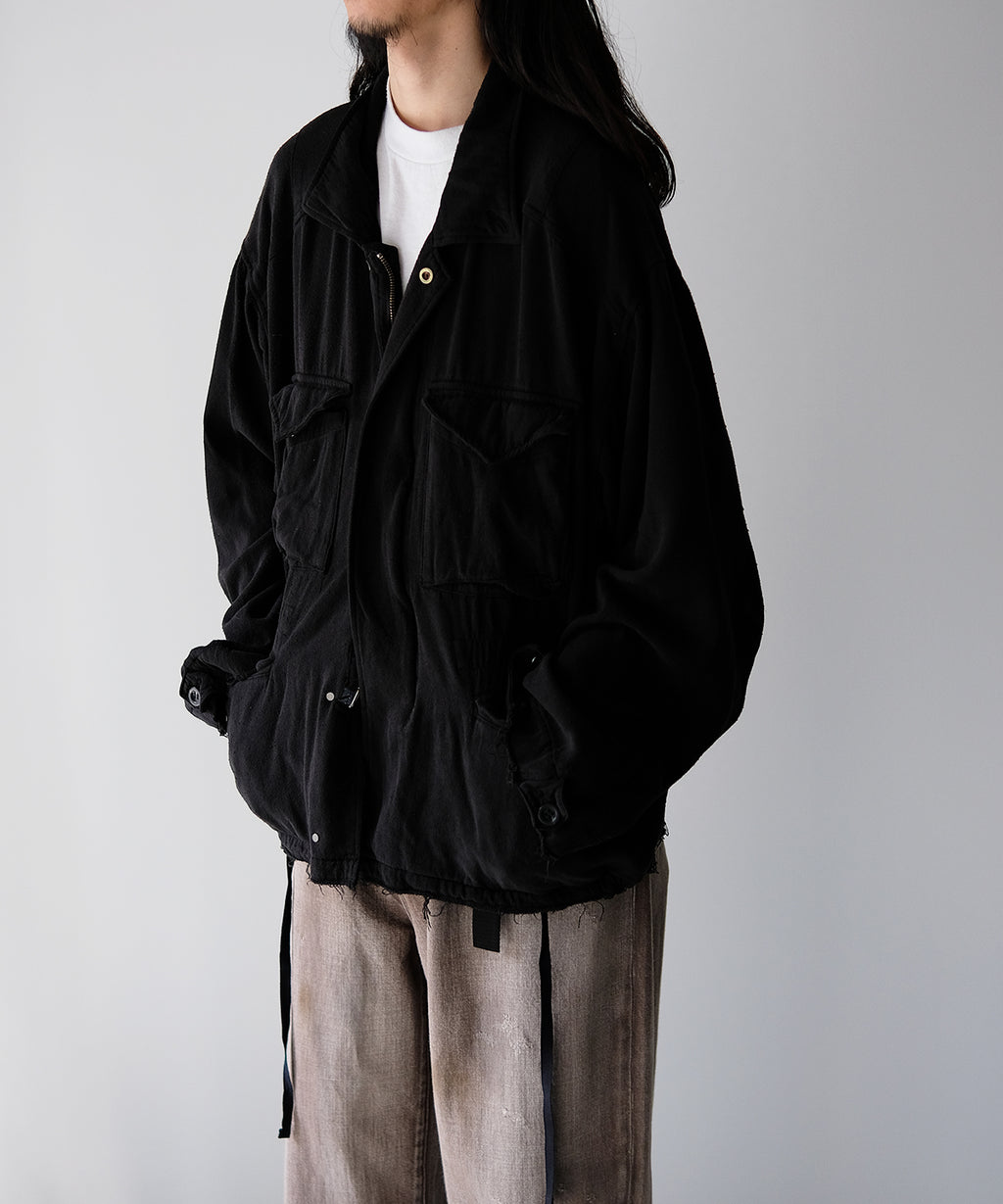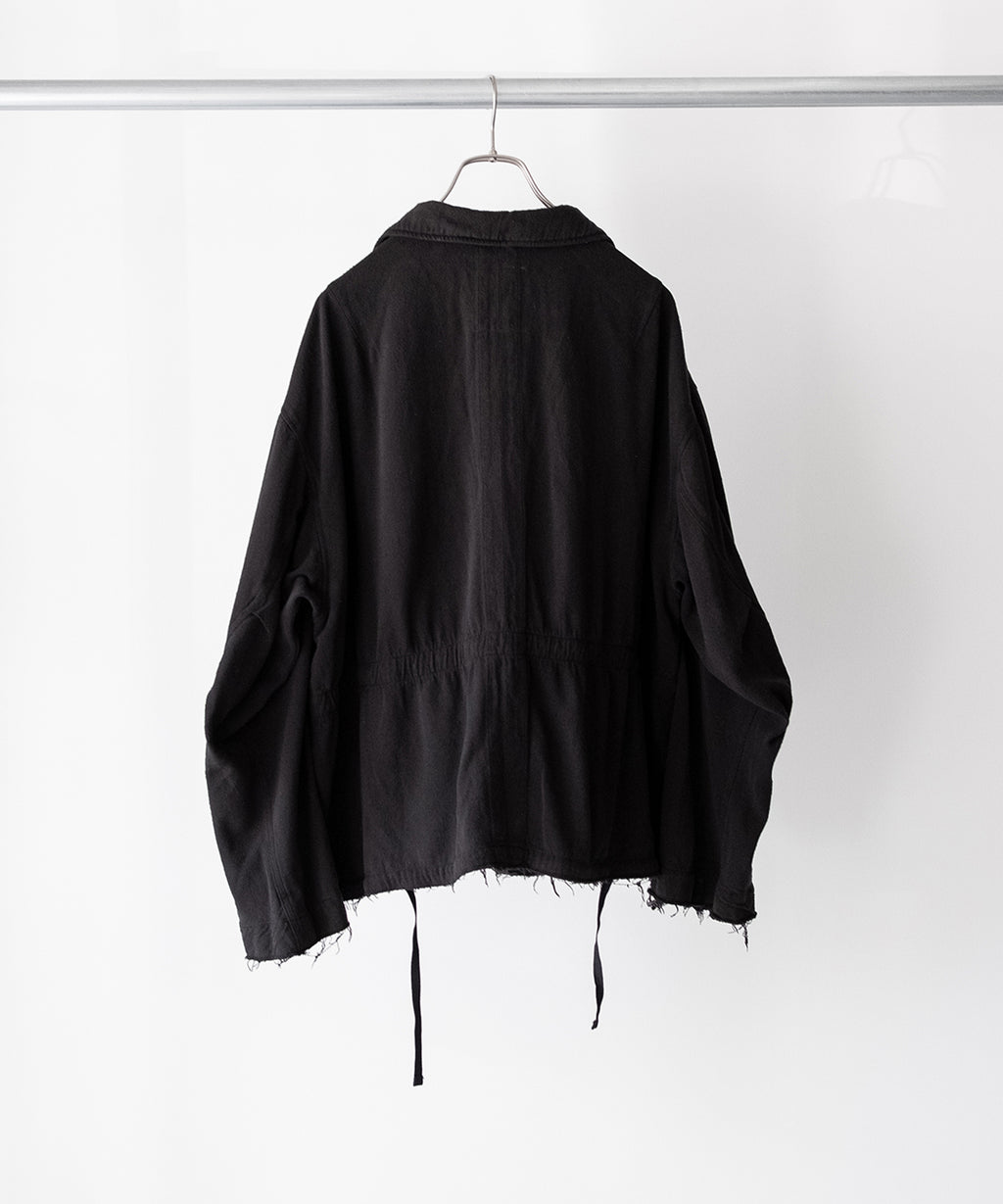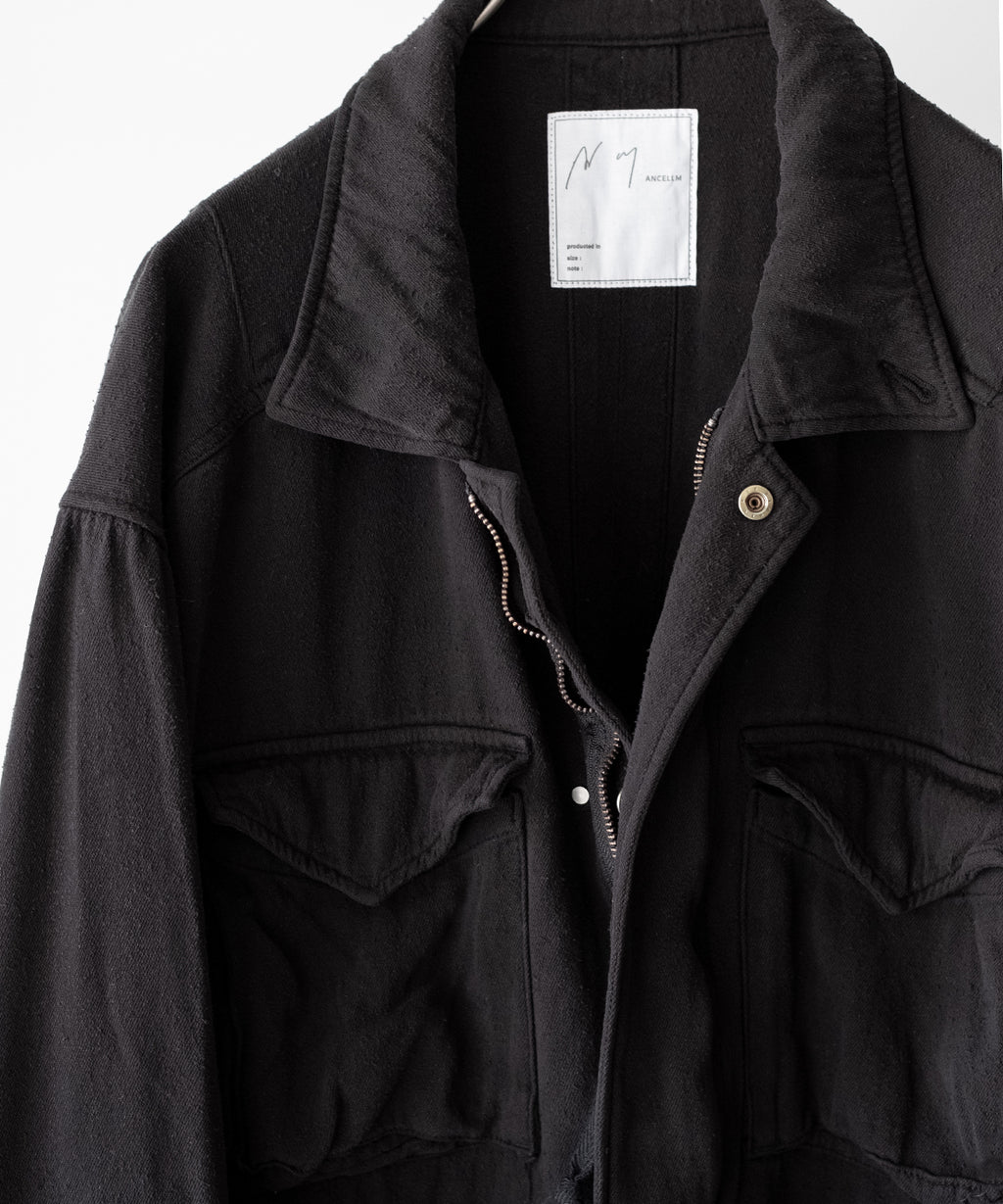 <<商品説明>>ANCELLM(アンセルム)のライトジャケット。フィールドジャケットベースに、アンセルムらしいワイドフォルムのリラックスシルエットです。シルクネップのツイルを製品染めし、BLACKはしっかりと濃く、各所の裾はカットオフ、表面のネップ感も相まって廃棄的な雰囲気と、シルクの柔らかな照りが上品にミックスされた唯一無二の風貌です。