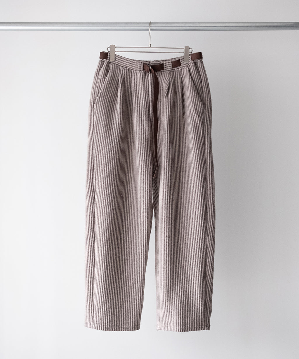 <<商品説明>>ANCELLM(アンセルム)のワイドパンツ。ゆとりある腰回りから、少しテーパードしたワイドテーパードシルエット。別地のナイロンテープのベルトのついたクライミングウェアのディテールがアクセントになっています。コットンウールのコーデュロイライクな肉厚カットソーで作られており、膨らみと柔らかさある素材感と相まって、愛嬌的な雰囲気です。